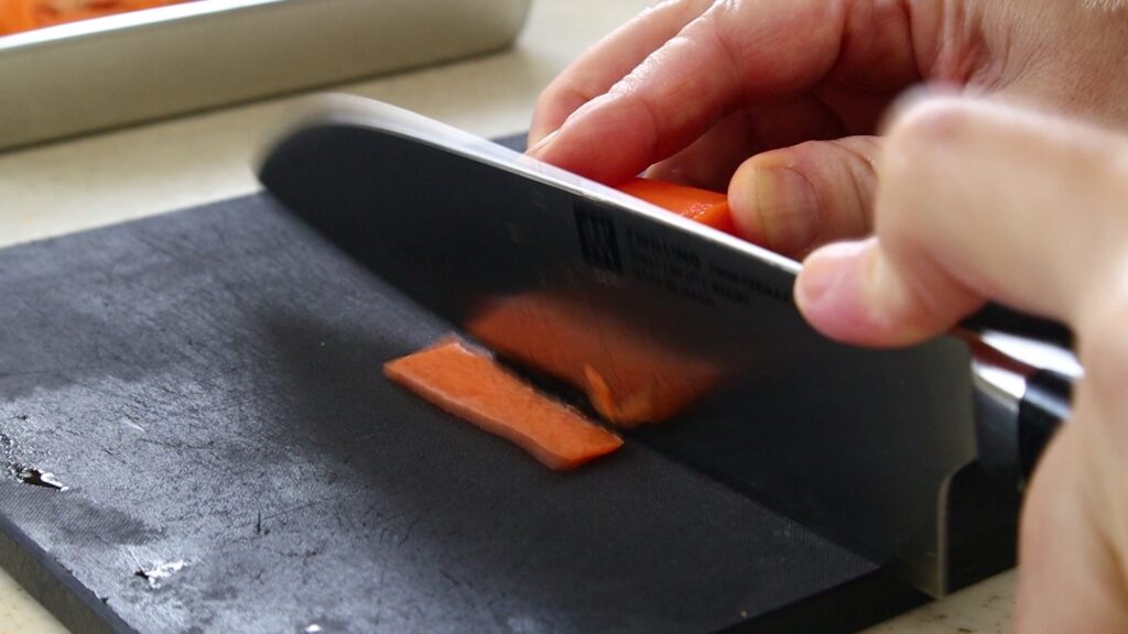厚みをそろえることを意識しながら切りましょう。