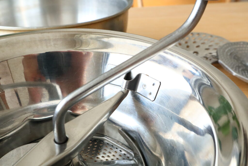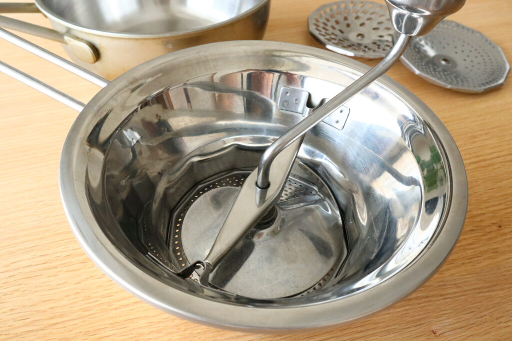 大量の材料をつぶしながら濾すのに便利な道具です。