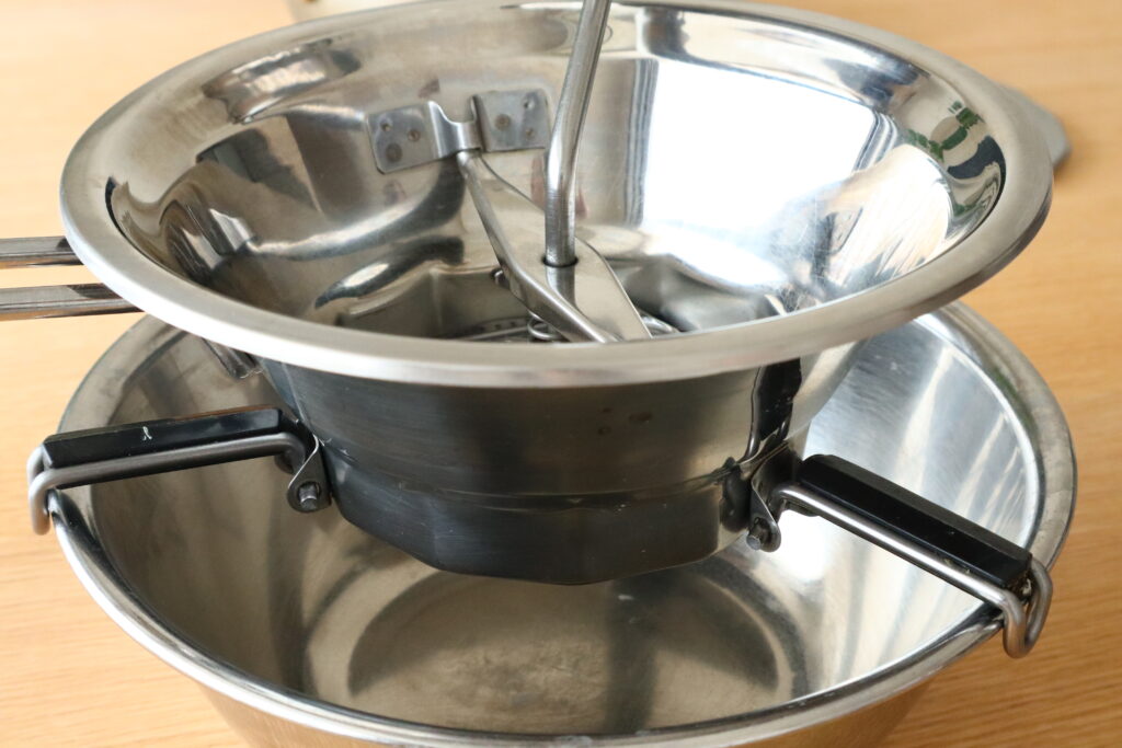 教室で使っているものは足がついているので、ボウルや鍋に置いて安定して使えます。