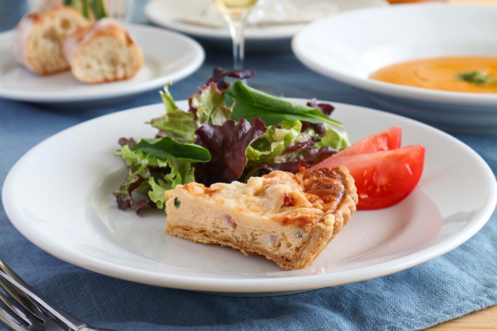 キッシュの生地に使われるブリゼ生地(練りこみパイ生地)は、ご家庭で作りやすいパイ用の生地。料理にもお菓子にも使える生地です。今回は半分をフランス ロレーヌ地方の名物料理キッシュ・ロレーヌに、もう半分を当日のお楽しみの具で作るキッシュにして、2種類の味を楽しんでいただける仕立てにします。
