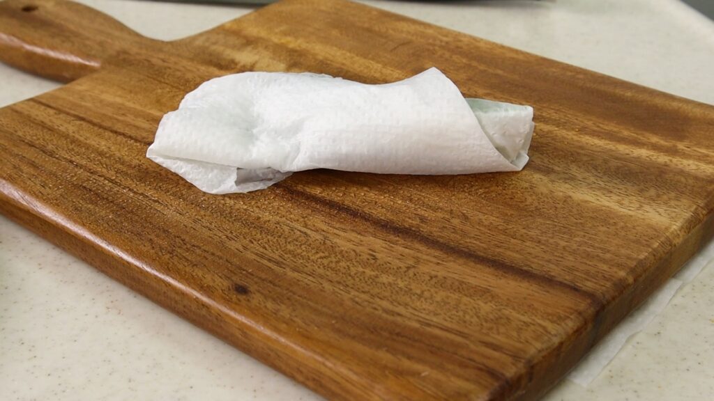 キッチンペーパーで包み、霧吹きで軽く湿らせます。
