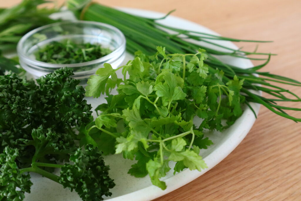 包丁で何度も叩くように刻むと、ハーブの繊維が潰れて水分が出てしまい、色が悪くなるだけでなく香りも逃げてしまいます。「切る」ことを意識して、一度で刃を動かすのがポイントです。