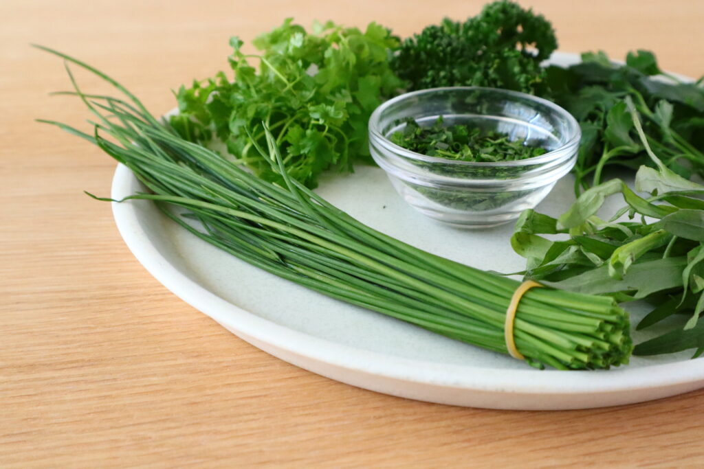 葉に水気が残っていたり、まな板や包丁が濡れていたりすると、切ったそばからハーブが黒ずんでしまいます。ハーブに余分な水気があればペーパーで取り、まな板や包丁もしっかり拭いておきましょう。