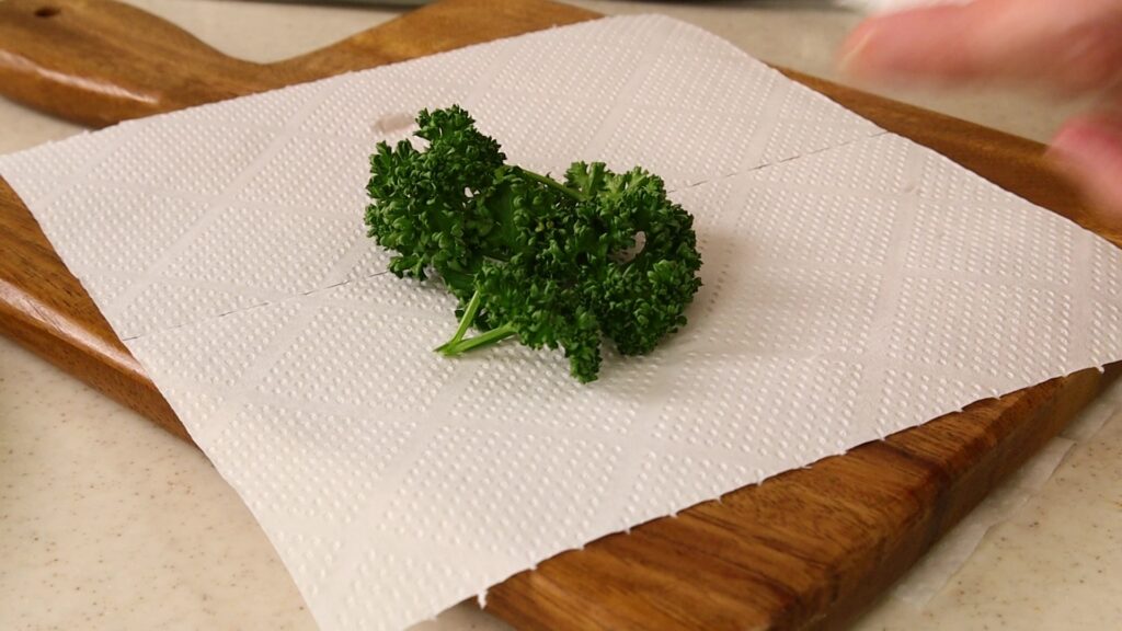 ハーブはパックに入って売られていることが多いですが、そのまま冷蔵庫に入れておくと、乾燥でしなしなになってしまいます。ハーブを長く楽しめるように、買ってきたらまずこの作業をしてあげてください。