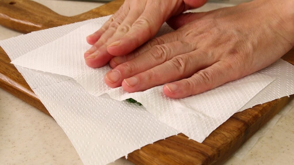 キッチンペーパーで包み、霧吹きで軽く湿らせます。