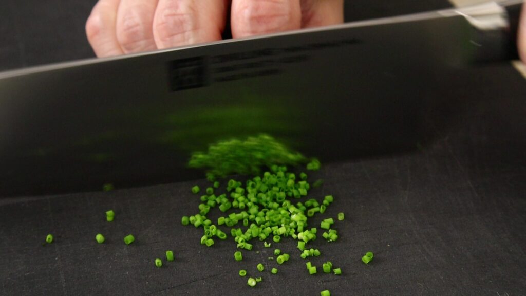 包丁で叩くように刻むと、ハーブの繊維が潰れて水分が出てしまい、色が悪くなるだけでなく香りも逃げてしまいます。「切る」ことを意識して、包丁を滑らせるように動かすのがポイントです。