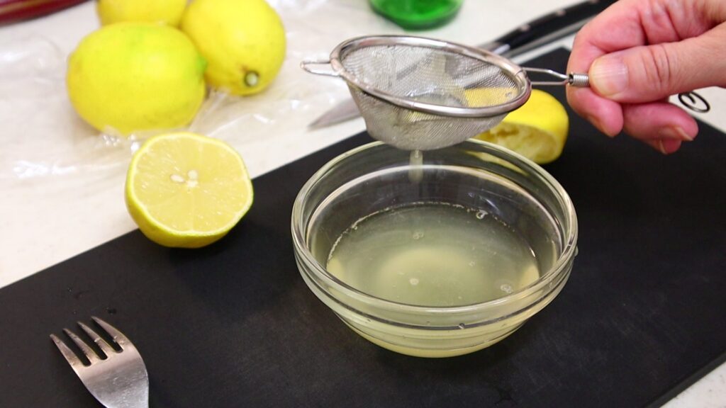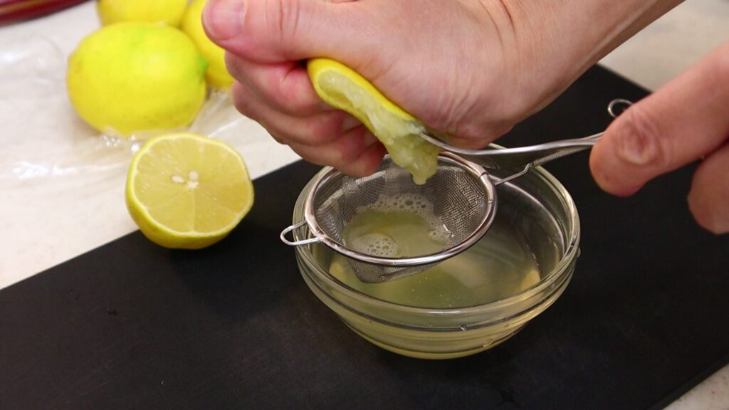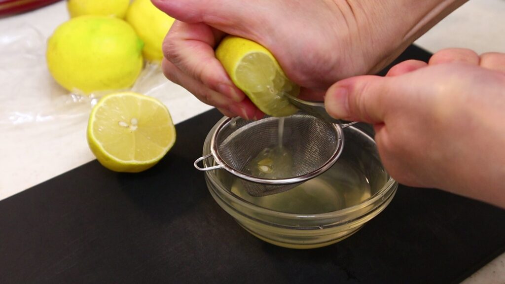 ボウルに茶こしを載せておくと、果汁だけを取り出すことができます。