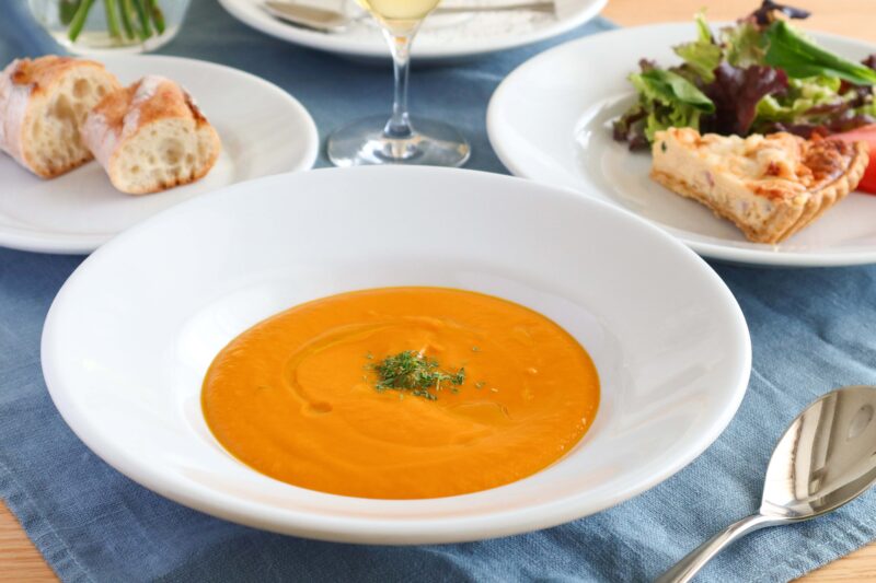 かぼちゃに含まれるβカロテンは、体内で粘膜や呼吸器系を守るビタミンAに変化し風邪の予防に役立ち、また水溶性、不溶性食物繊維も豊富で、体の調子を整えてくれます。ポタージュはこういった食材の栄養を逃さず摂ることができるので、効率的に野菜をとるのにおすすめです。冬においしくなるかぼちゃの甘みをしっかりと引き出し、体が芯から温まるおいしいポタージュに仕上げます。