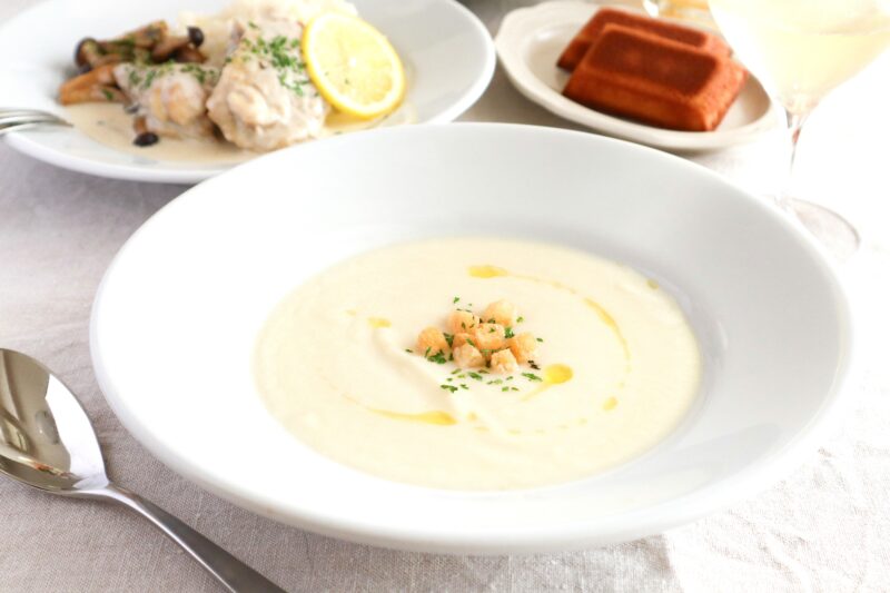 今回は旬を味わう新玉ねぎのポタージュをはじめ、煮込みの基本が学べる鶏肉のクリーム煮。バター菓子の定番フィナンシェを学びます。新しいことを始めたい、そんなこれからの季節にぴったりの、フランス料理の基礎が詰まったお料理です。