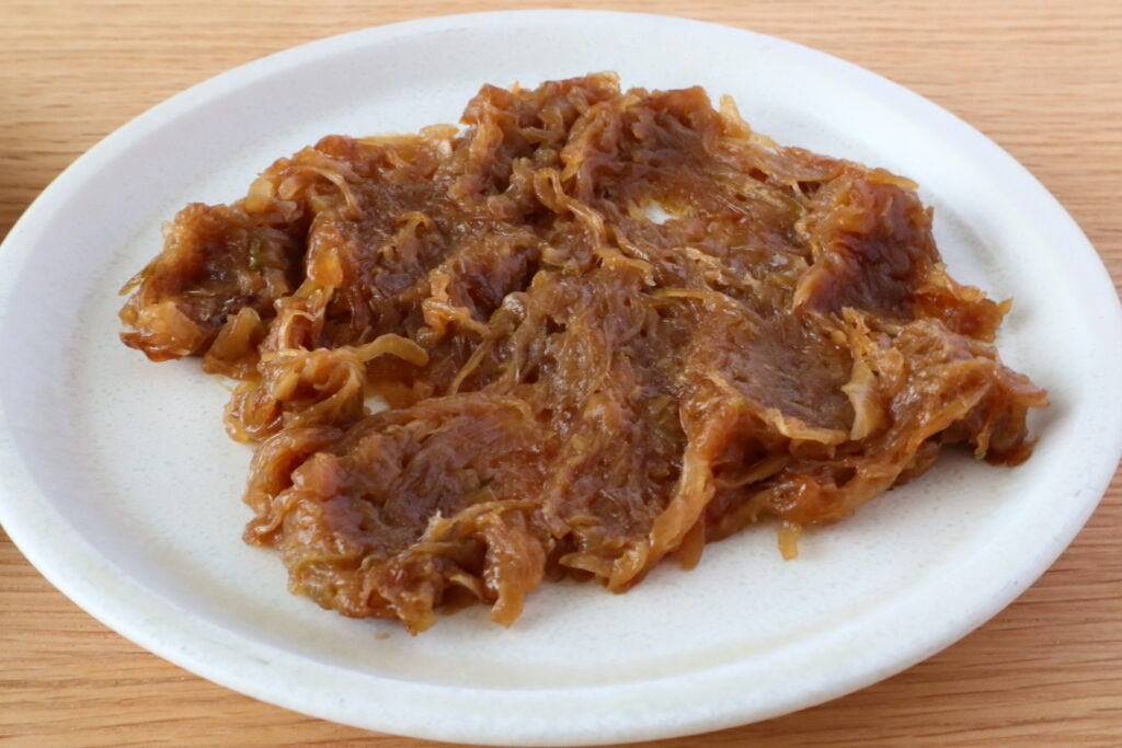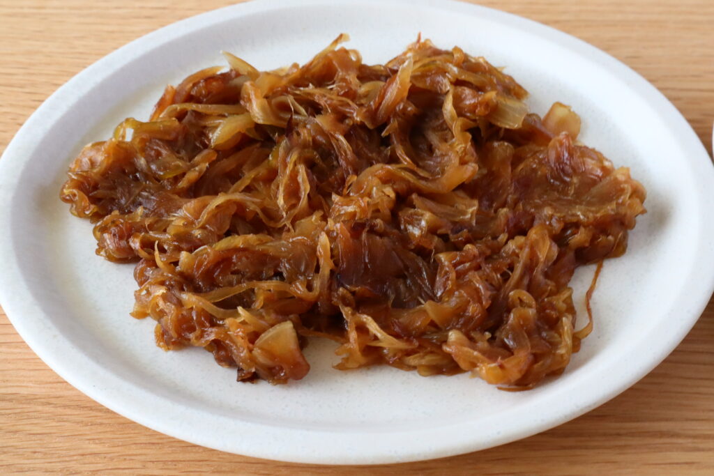 レッスンでは玉ねぎを繊維に沿って切り、形や食感が仕上がりに残るようにしていますが、繊維を断つように切るとどんな違いがあるのか、参考のために比較してみました。