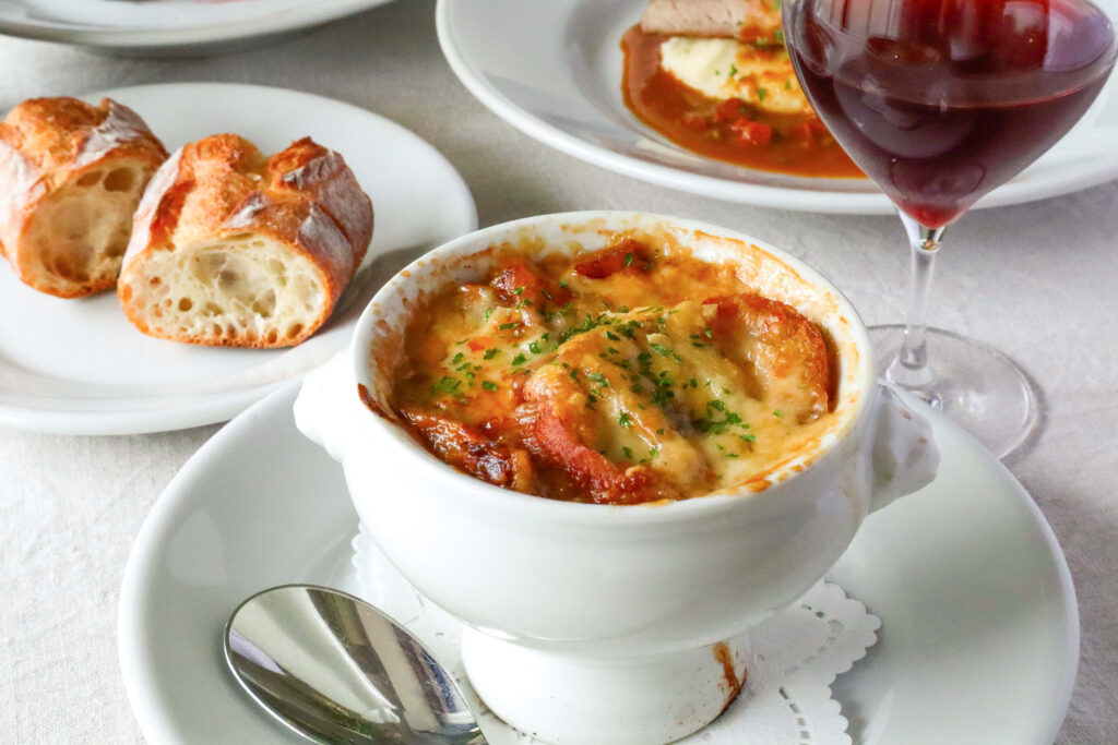 11月のフレンチ基礎レッスンでご紹介しているオニオングラタンスープ。