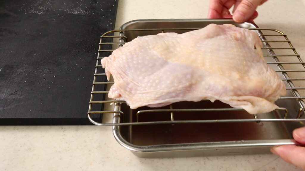 バットに網をのせ、鶏肉の皮目を上にして置きます。