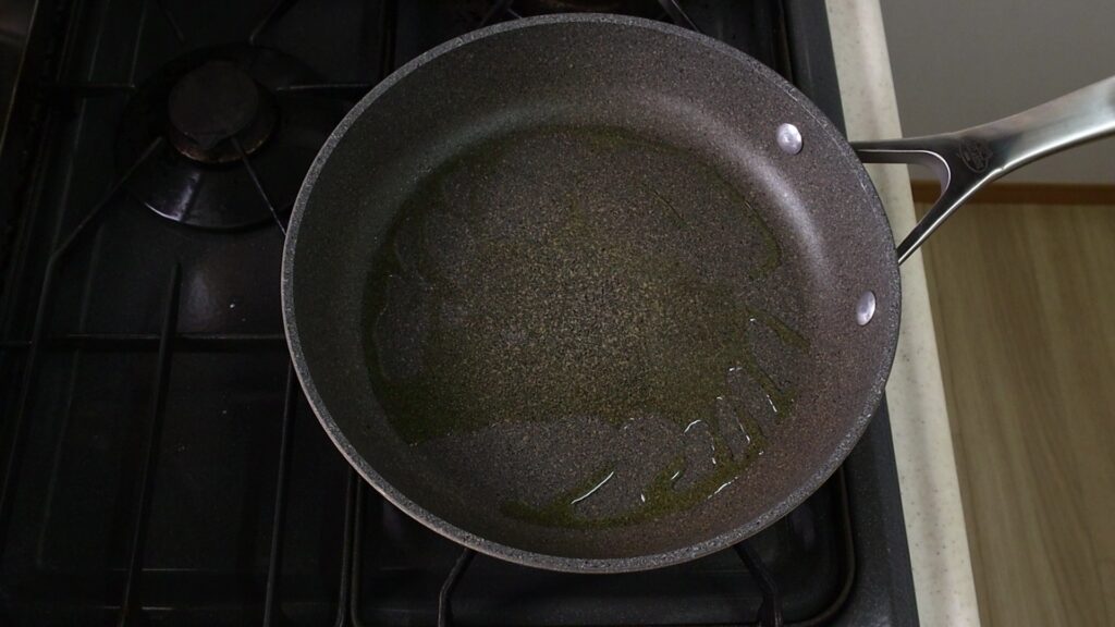フライパンにオリーブオイルを入れて、中火でじっくり温めます。